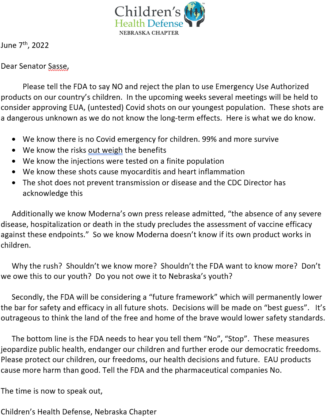 The Children’s Health Defense – Nebraska Chapter sent a letter to Nebraska’s U.S. Senators and Congressmen regarding the upcoming FDA decision on allowing the Emergency Use Authorization of the covid shot to young children. In addition, we spoke out on the FDA’s upcoming consideration of a “future framework” that will reduce testing and safety measures for future shots. See the image and text below.
